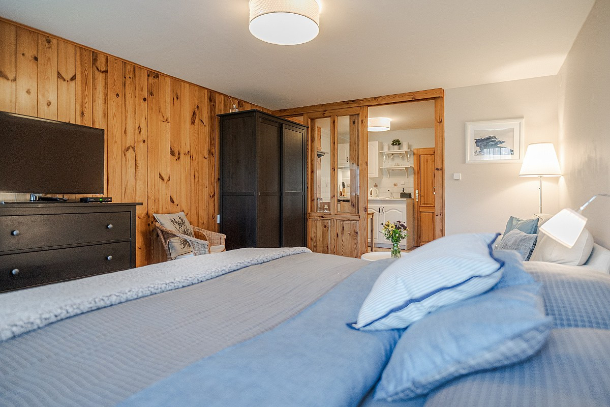 Prostorný útulný apartmán o celkové výměře 28 m² je situovaný v prvním patře penzionu, jeho dispozice je 1+1. Apartmán se skládá ze dvou místností. Ložnice s obývacím pokojem je vybavena manželskou postelí a pohovkou na lenošení. V druhé místnosti je vybavená kuchyňka s jídelním stolem. Apartmán má vlastní koupelnu se sprchovým koutem a toaletou.